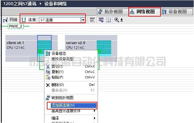 在“设备组态”中 ,选择“网络视图”栏进行配置网络,点中左上角的“连接”图标,连接框中选择“S7连接”,然后选中client v4.1 CPU(客户端),右键选择“添加新的连接”,在创建新连接对话框内,选择连接对象“server v2.0 CPU”,选择“主动建立连接”后建立新连接,如图 2 所示。