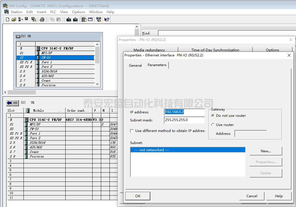 (7) 在弹出的“ Properties-Ethernet interface PN-IO”对话框的“ Parmeters”选项卡中为以太网接口设置 IP 地址192.168.0.2 和子网掩码 255.255.255.0,如图 60 所示。