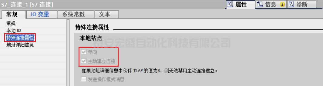 ② 特殊连接属性内,确认客户端 S7 单边连接参数:“单向”、“主动建立连接”勾选,如图 14 所示。