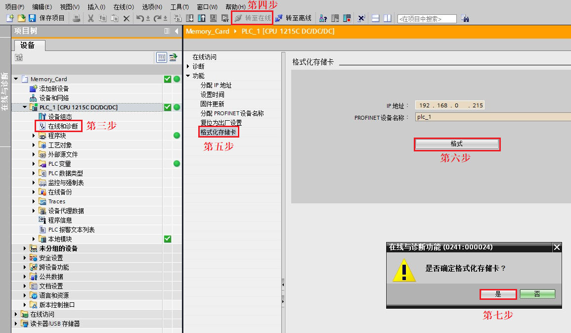 使用TIA STEP7格式化存储卡的具体步骤如下: