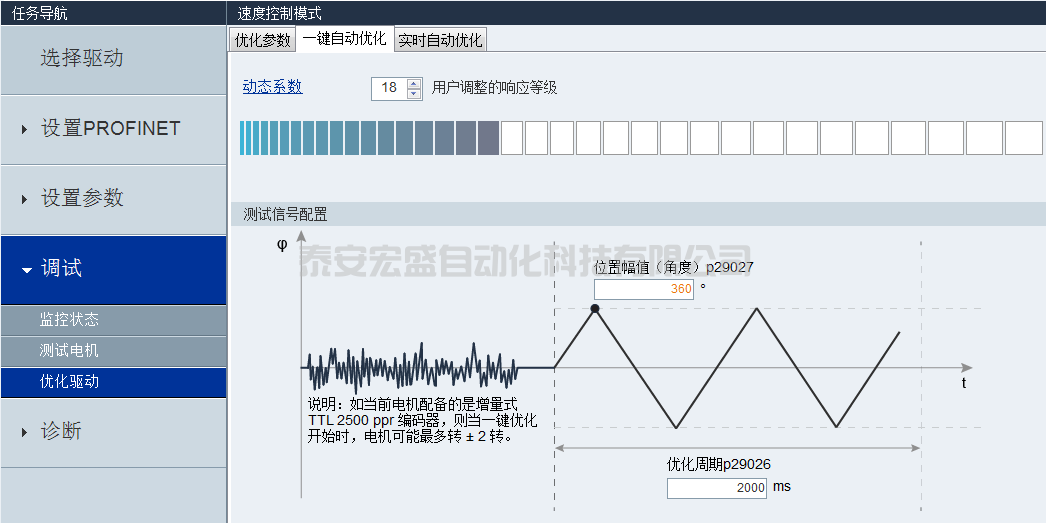 动态刚度等级:这是优化V90伺服电机的动态性能参数,数值越高,电机的动态相应特性越好。但是,过高的动态响应特性会引起电机的谐振,导致整个控制系统不稳定,根据摆动的需求选择合适的范围。