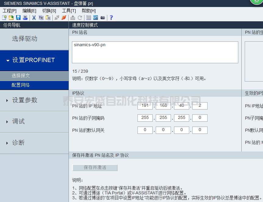 注意:PN站名和IP地址要和博图组态一致。在配置完设备名称以及 IP 地址之后,必须保存参数并重启驱动来激活配置。