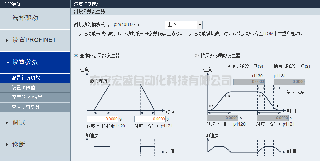 由于 S7-1200 轴工艺对象中已经组态了轴运行的加减速时间,所以在SINAMICS V-ASSISTANT 侧激活斜坡功能模块并将斜坡上升时间和斜坡下降时间设置为 0.0000 S