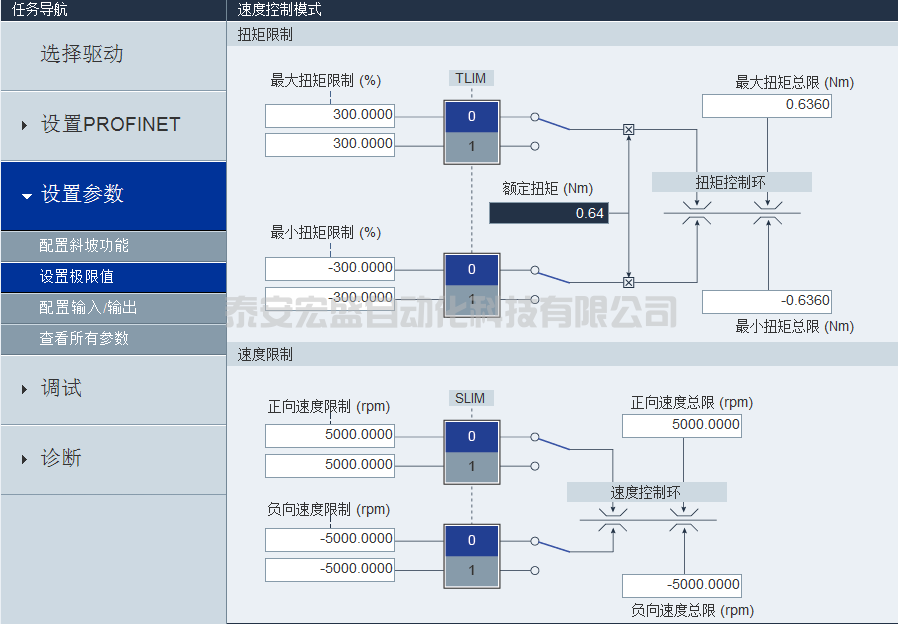 - 设置限值:扭矩和速度参数查阅电机铭牌或手册填写。