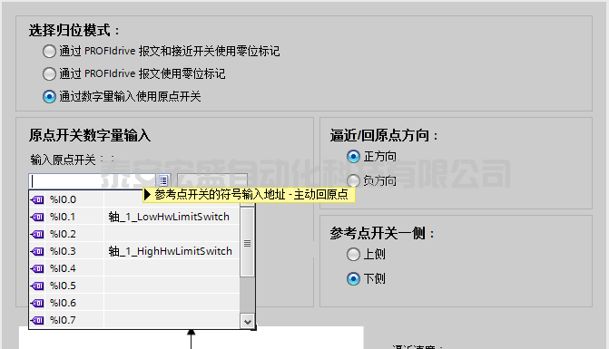 “通过数字量输入使用原点开关”,并输入开关地址。