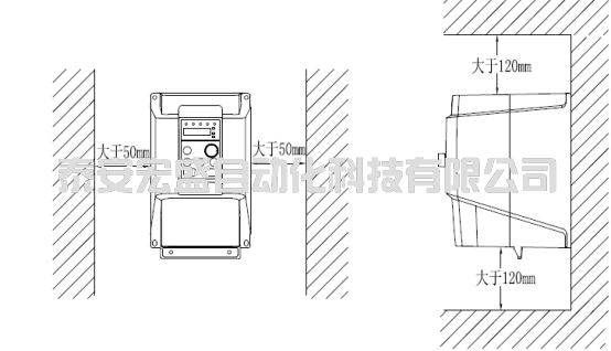 变频器需要安装在一个光滑的、垂直的、坚固的表面,其上下左右与相邻的物品或挡板(墙)必须保持足够的空间。