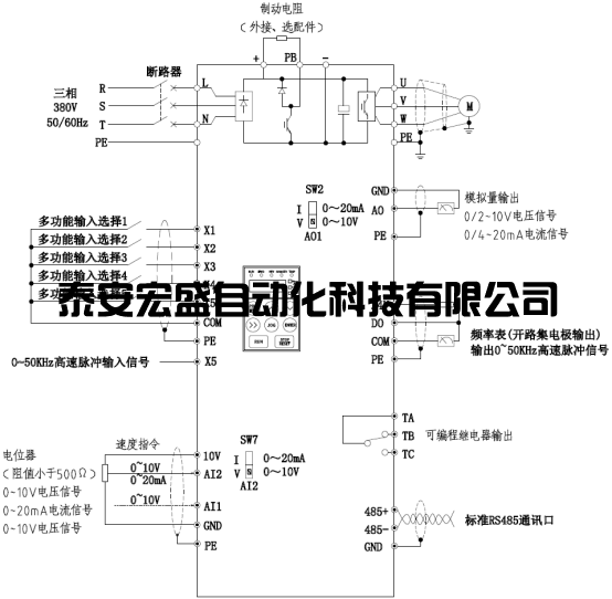 为了减小控制信号的干扰和衰减,控制信号连接线长度应限制在50m以内并与动力线的间隔距离大于30cm,尽量避免控制线与动力线平行走线。连接模拟输入、输出信号时,请使用屏蔽双绞线。