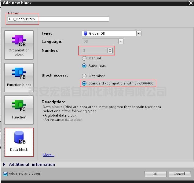| MB_DATA_PRT | 指向Modbus数据寄存器的指针:用于缓存从Modbus服务器接收的数据或将发送到Modbus服务器数据的缓冲区,可以是DB块或M区,如果是DB块则需要定义为“标准与S7- 300/400兼容”的类型,见下图3; |